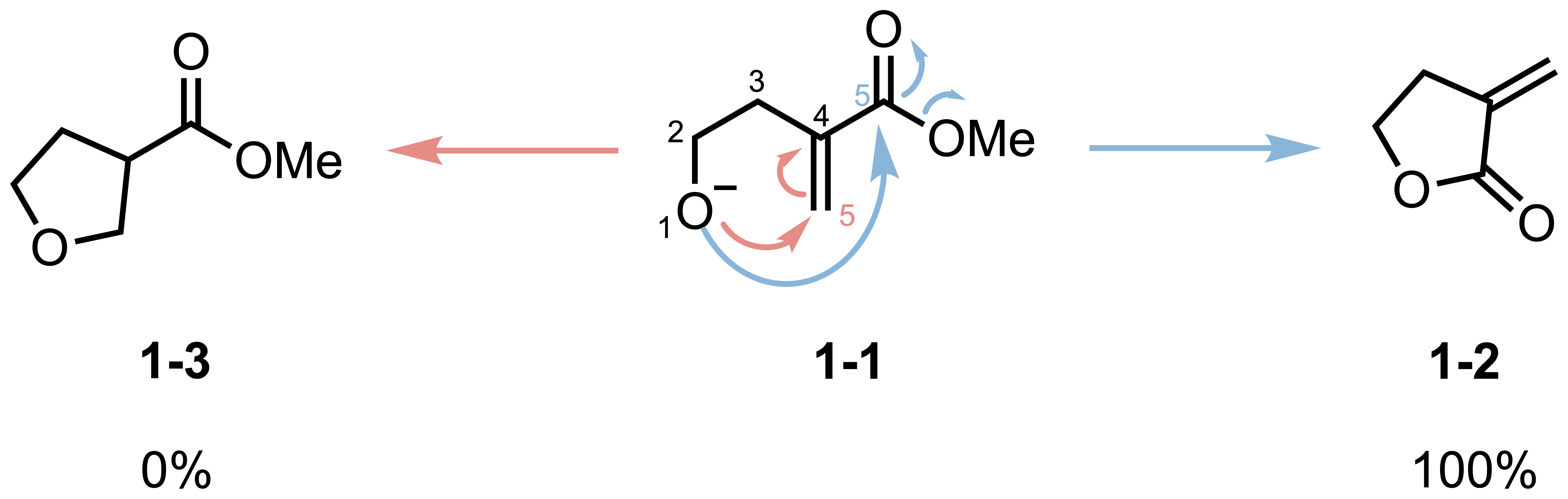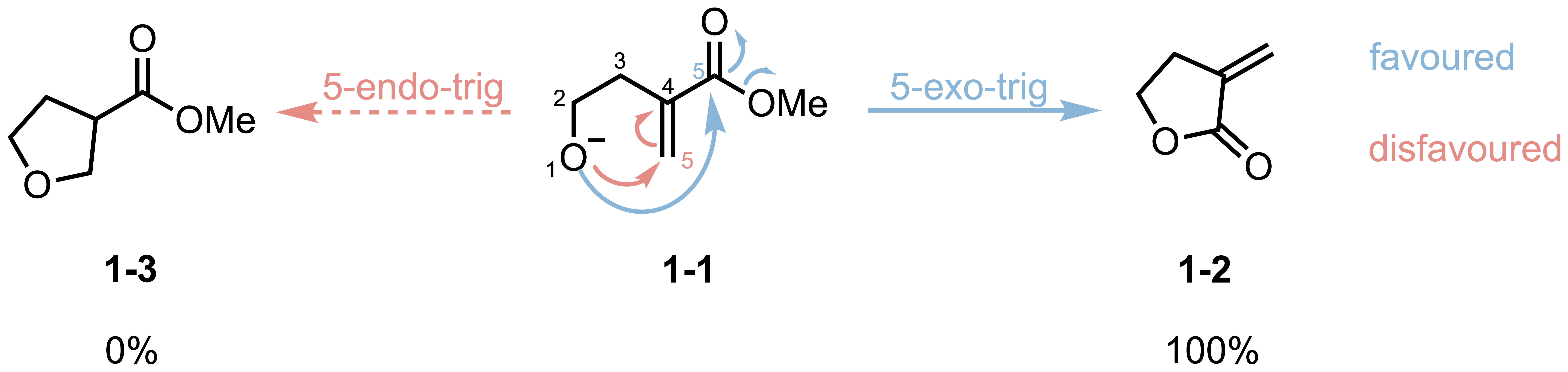 With the Baldwin’s rules in hand, now we can understand the selectivity shown in the opening example. In the example, the molecule 1-1 can cyclize via two pathways:
