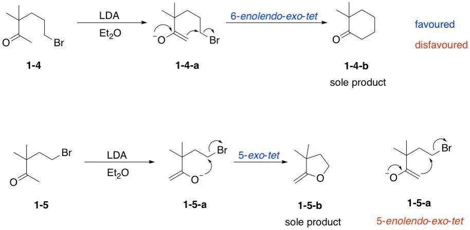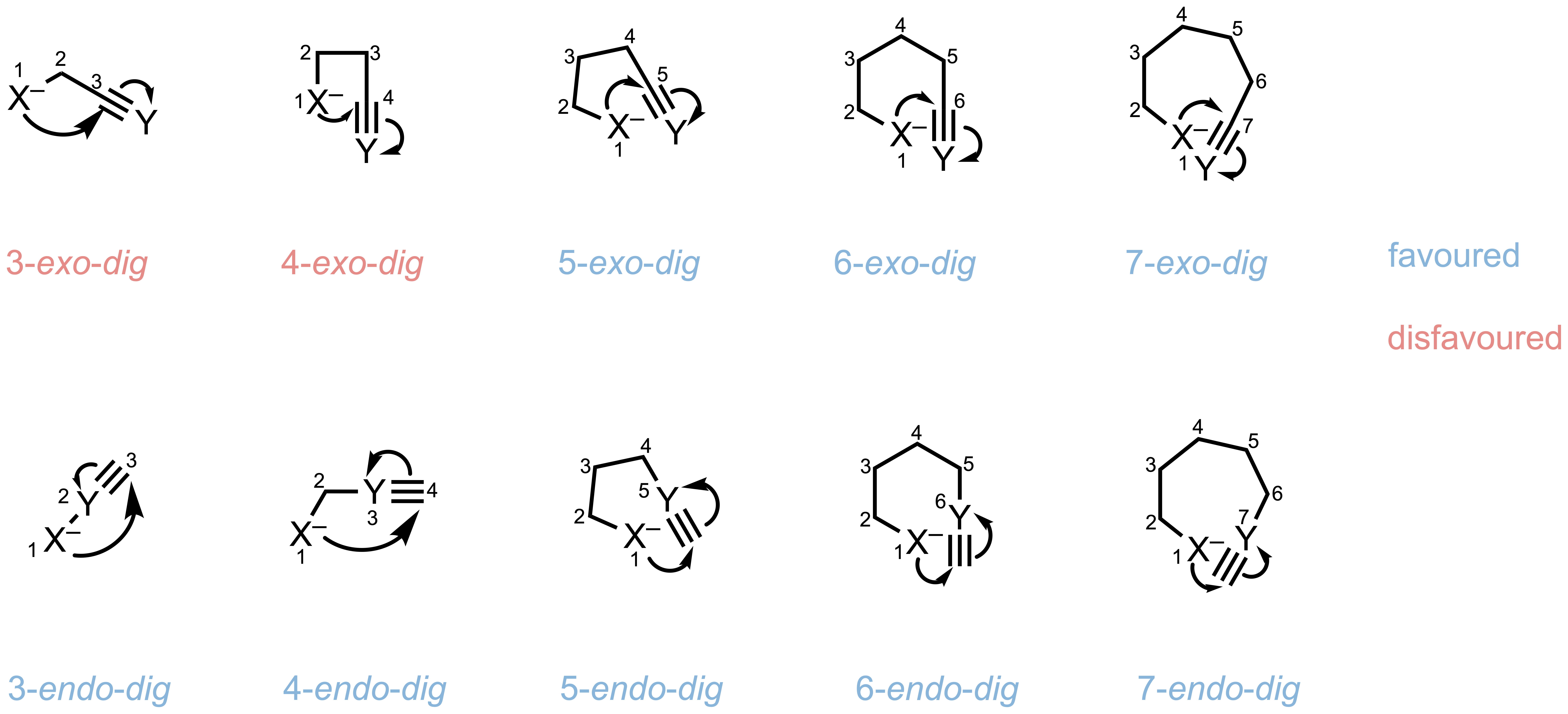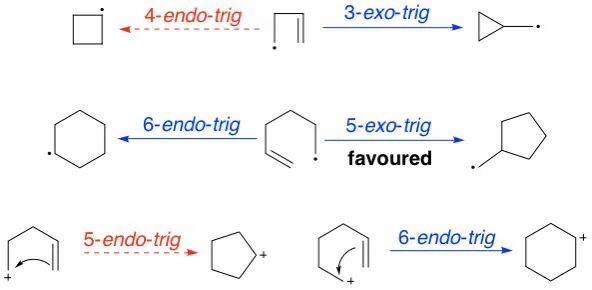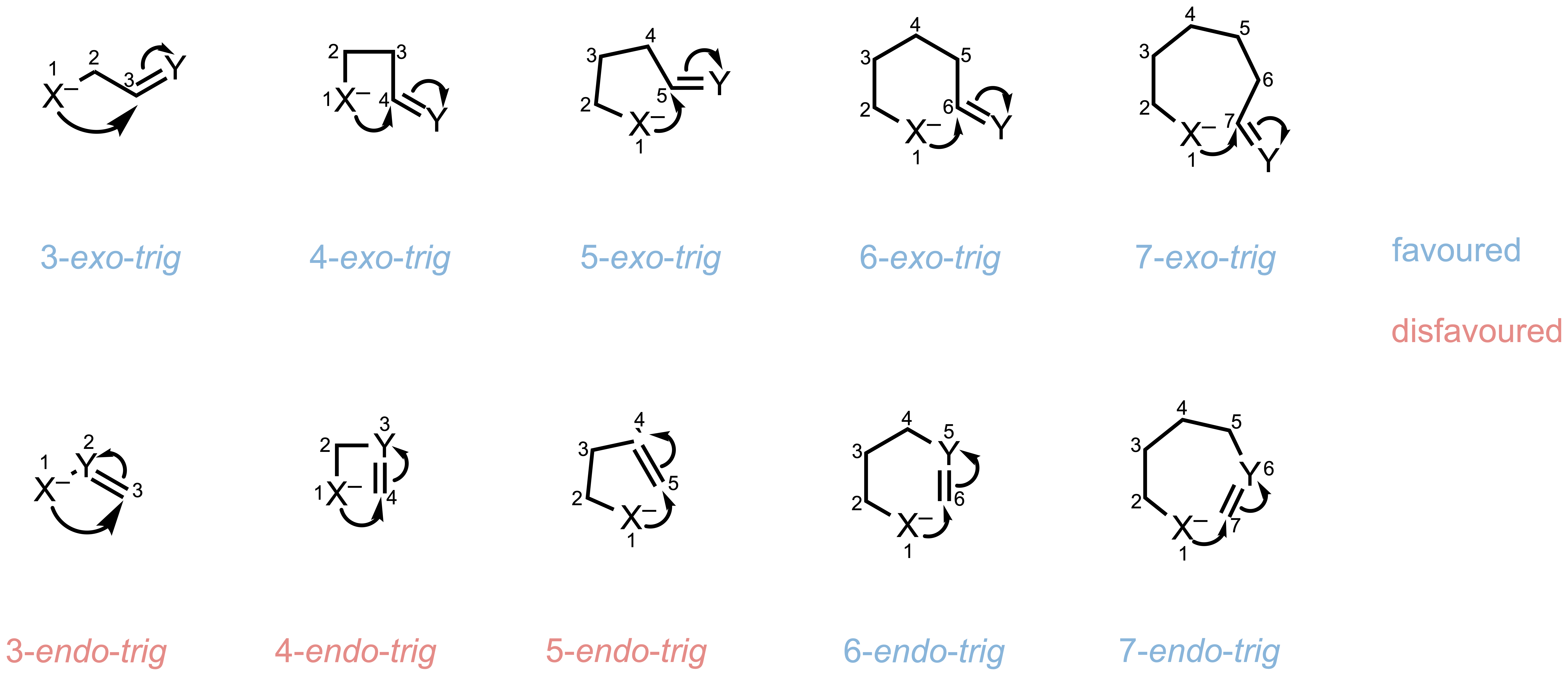 - For 3- to 5-membered rings, the enolendo-exo-trig processes are disfavored.