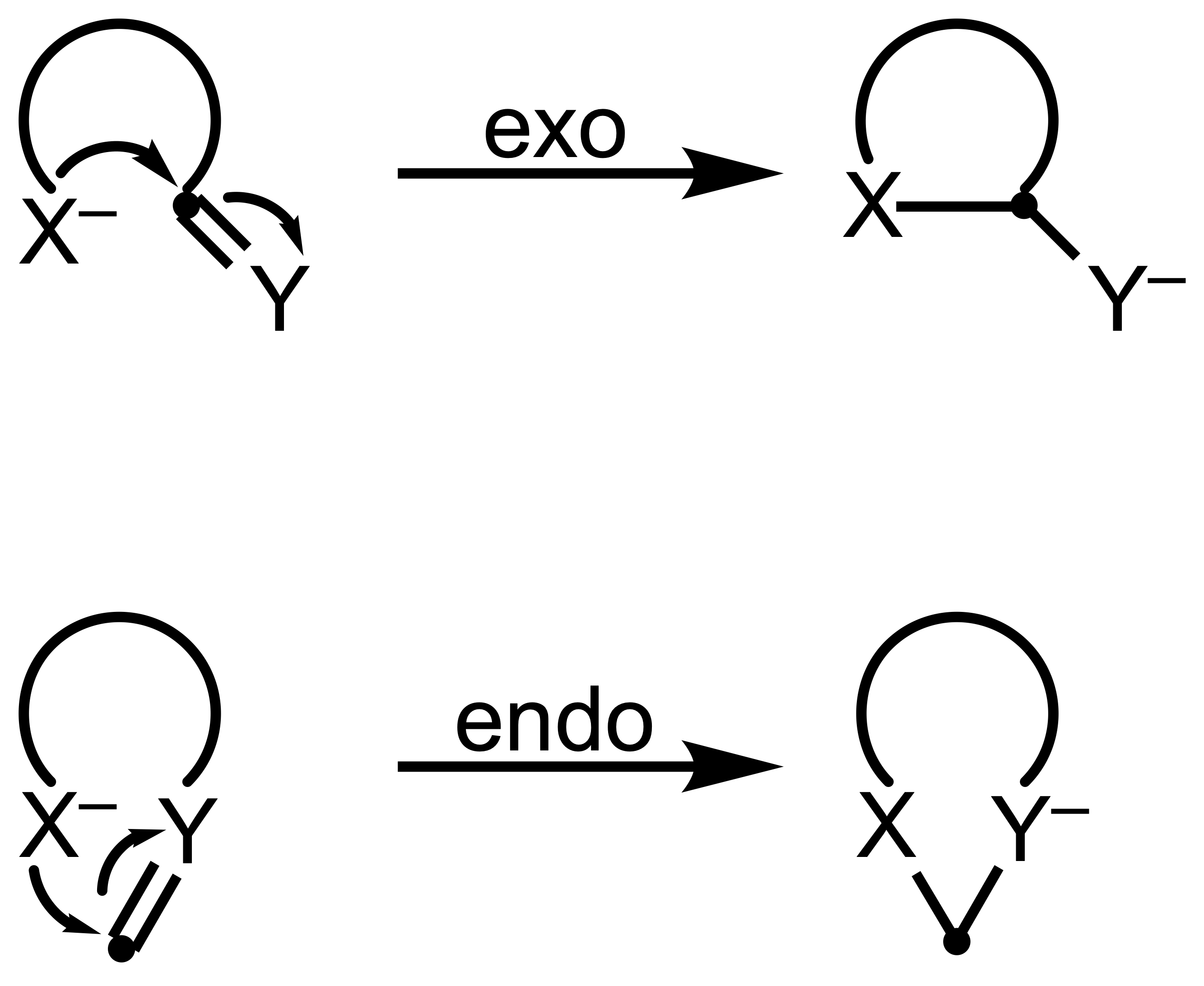 - exo (exocyclic): The bond being broken lies outside the ring being formed. This ultimately produces a smaller ring.