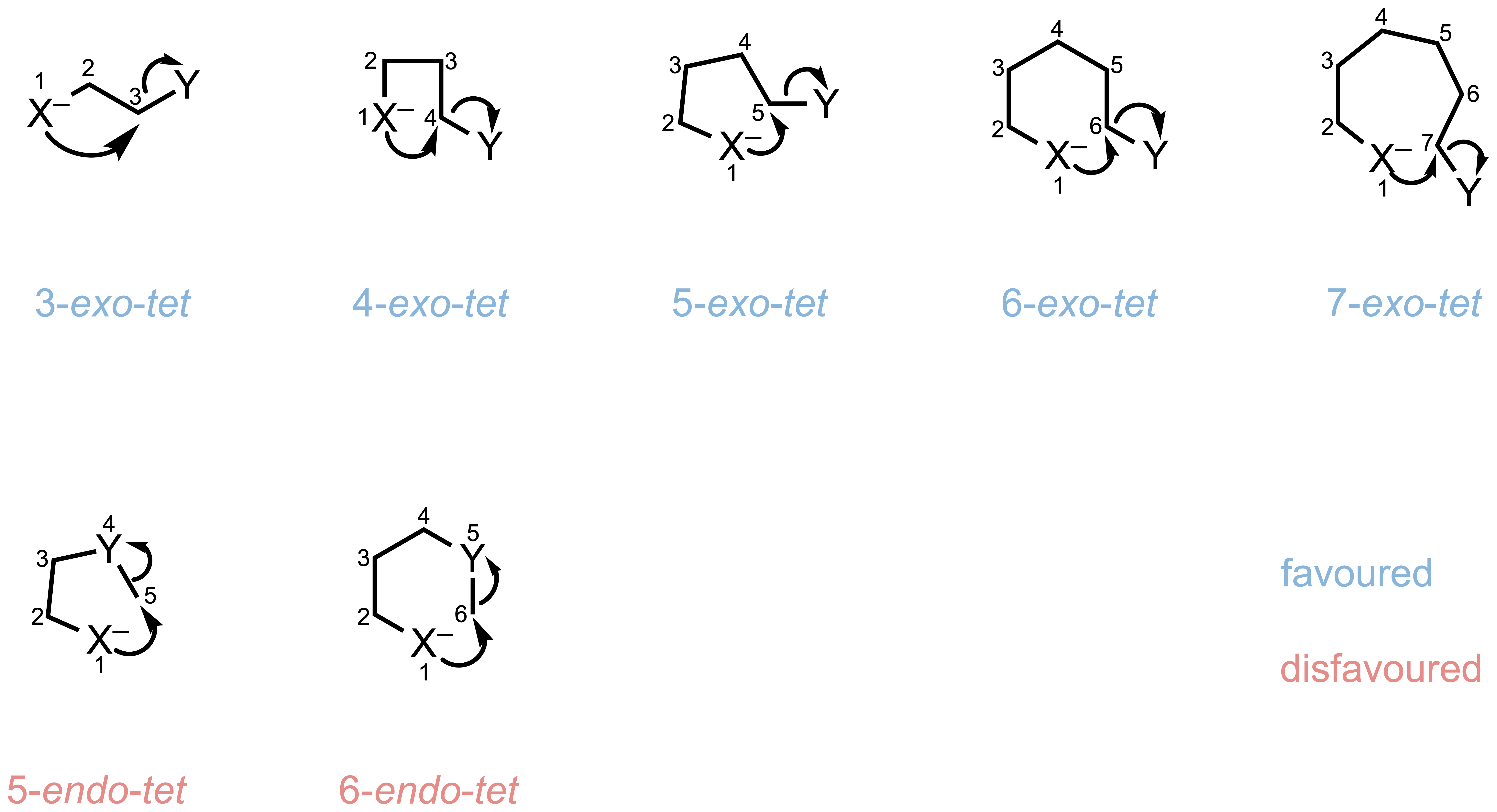 - For 3- to 5-membered rings, the enolendo-exo-tet processes are disfavored.